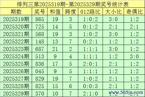 开奖总结:摆设三第2025329期奖号开出:370,组选类型:组六,大小比为1:2,奇偶比为2:1,和值为10,跨度为7。